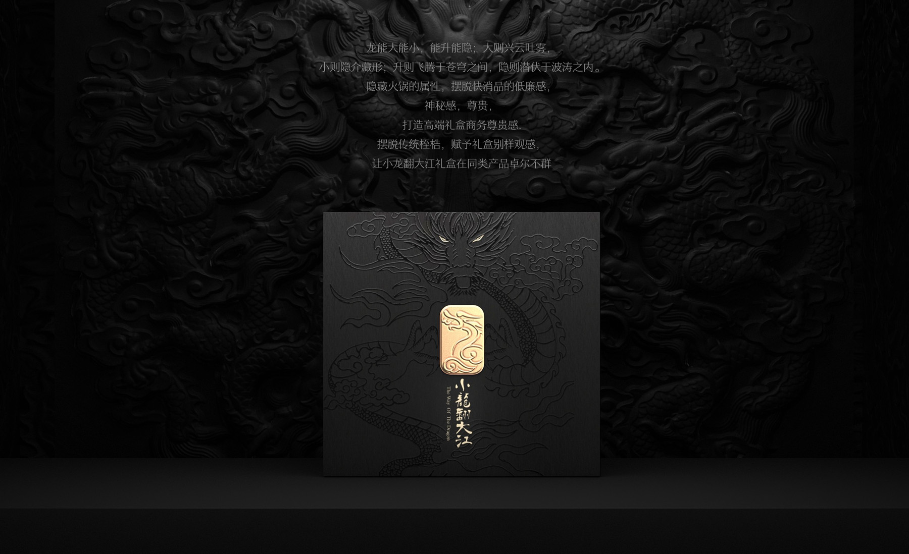 龍能大能小,能升能隱,大則興雲吐霧;小則隱介藏形, 升則飛(fēi)騰於(yú)蒼(cāng)穹之間;隱則潛伏於波濤之內。隱藏火鍋的屬性,擺脫快消品的低廉感,神秘感、尊貴、打造高端(duān)禮盒商務尊貴感。擺脫(tuō)傳統桎梏,賦予禮盒別樣觀(guān)感,讓小龍翻大江禮(lǐ)盒在同類產品卓爾不群。