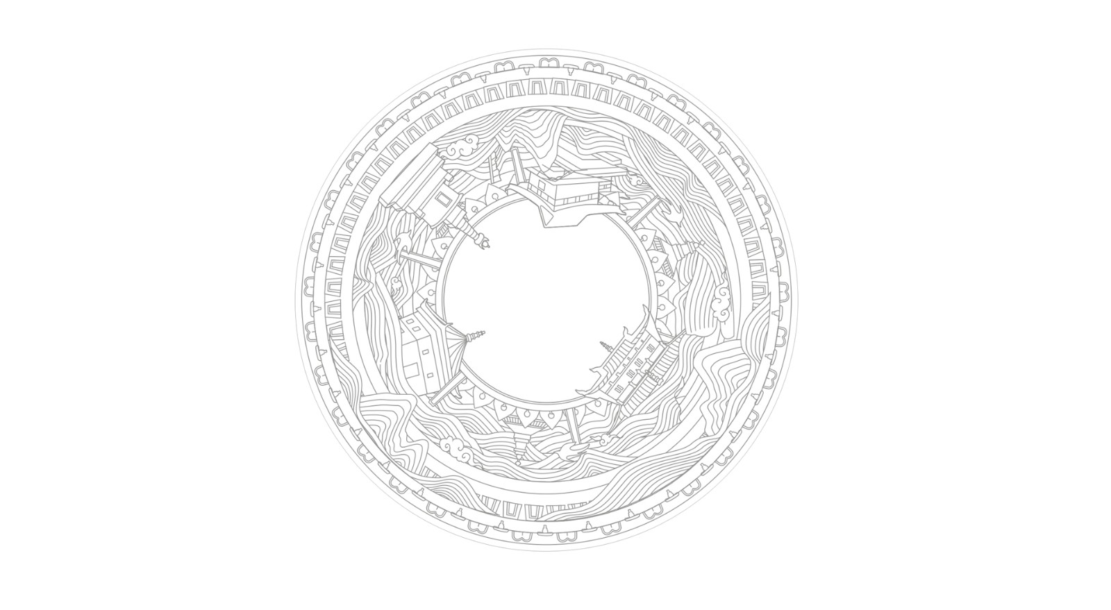 保留圓形的構成方式,重新勾勒山水(shuǐ)圖景